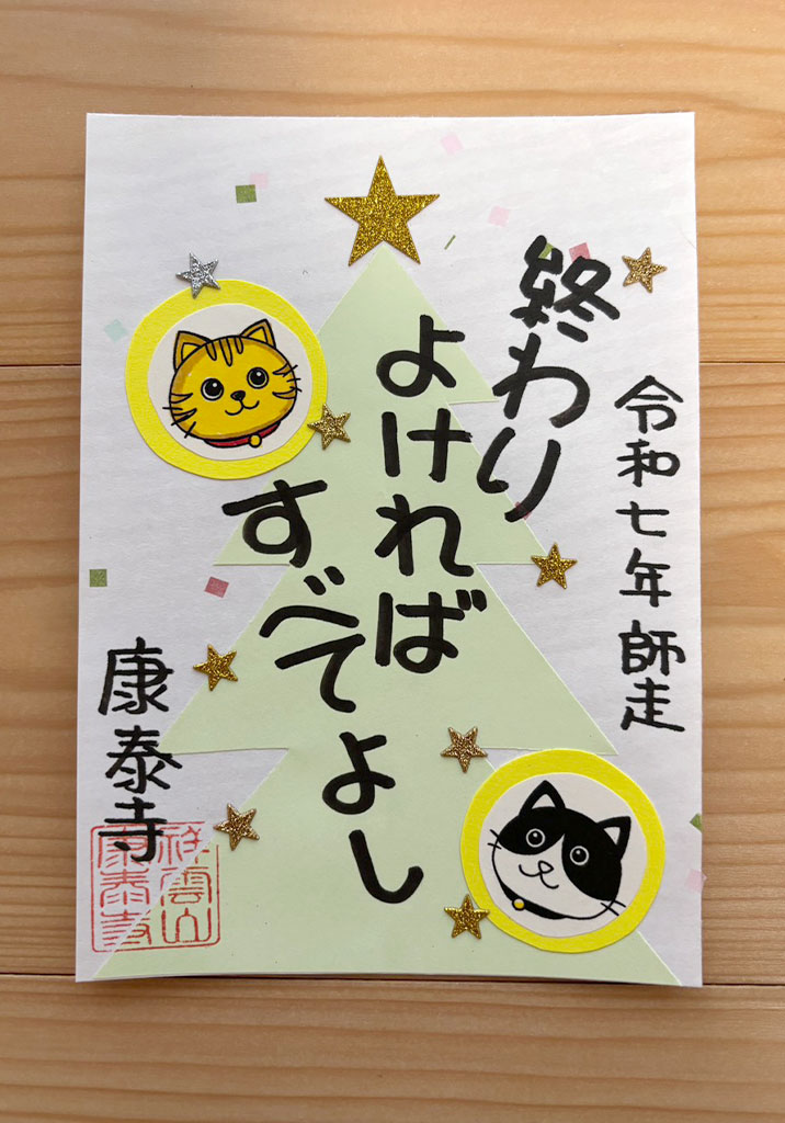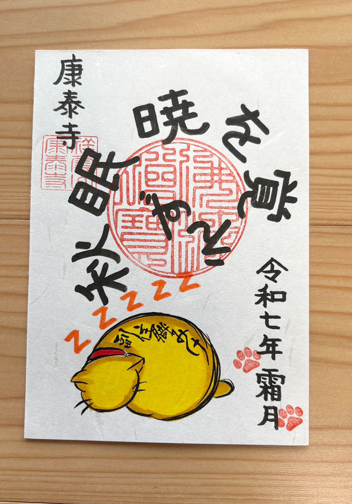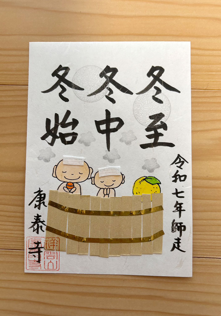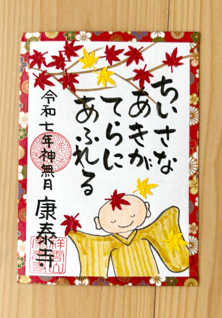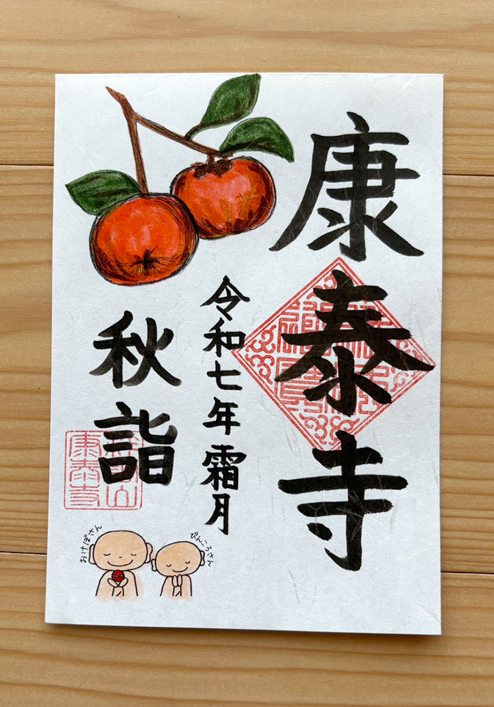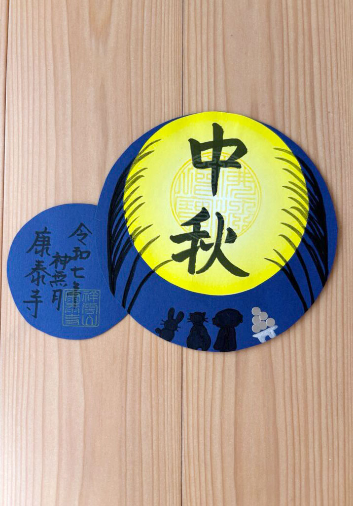 いつものお地蔵さんがちょっとおしゃれしました。まあるい気持ちで、という思いからまるい形のご朱印にしました。康泰寺ファミリーみんなで心をこめて1枚1枚つくりました。