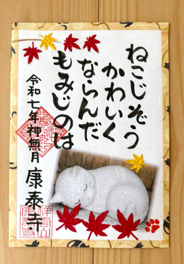 昨年 しあわせねこ地蔵にかわいくもみじが供えられていました その様子をご朱印にしたいと思い短歌っぽくしてみました